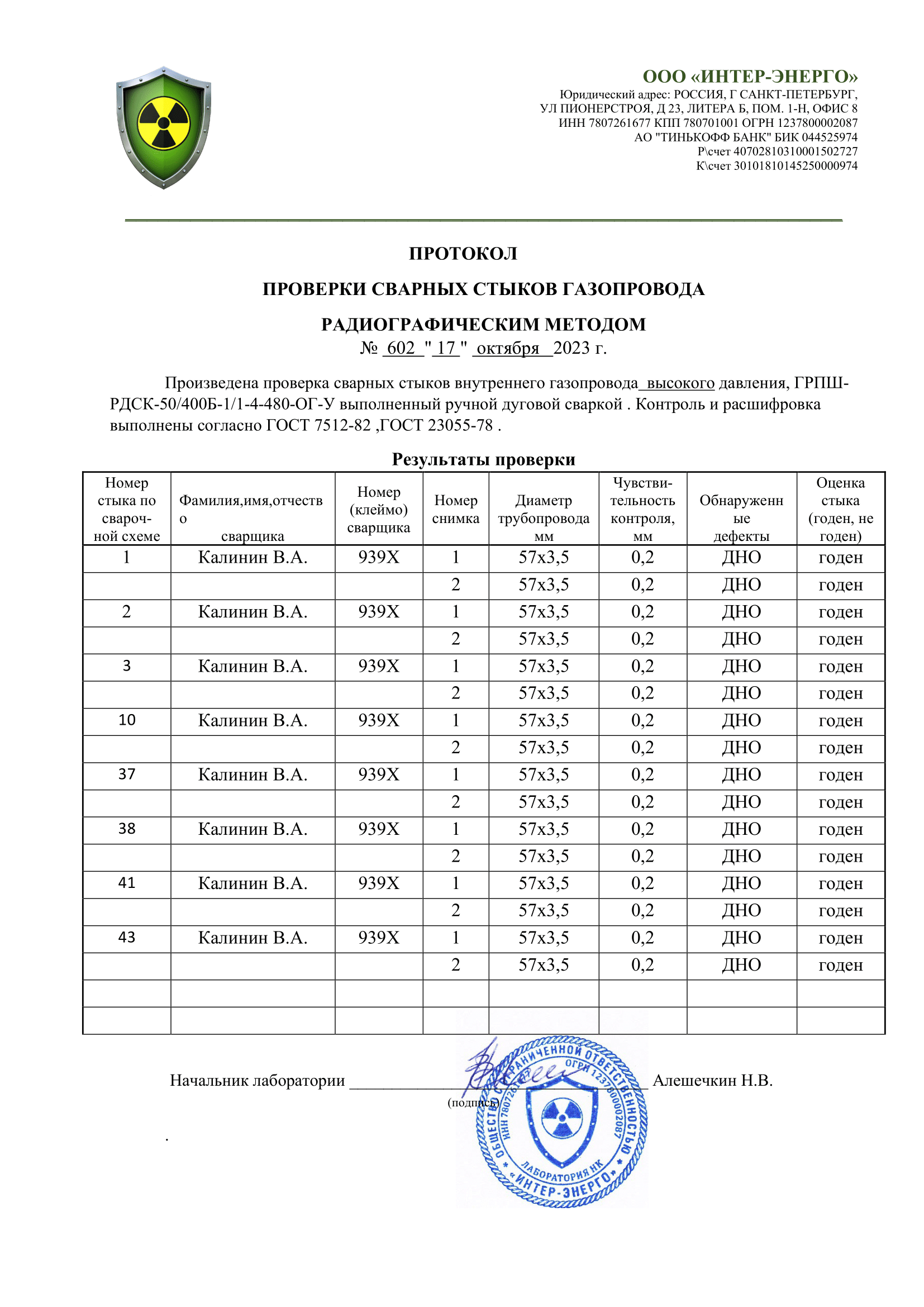 Протокол проверки сварных стыков